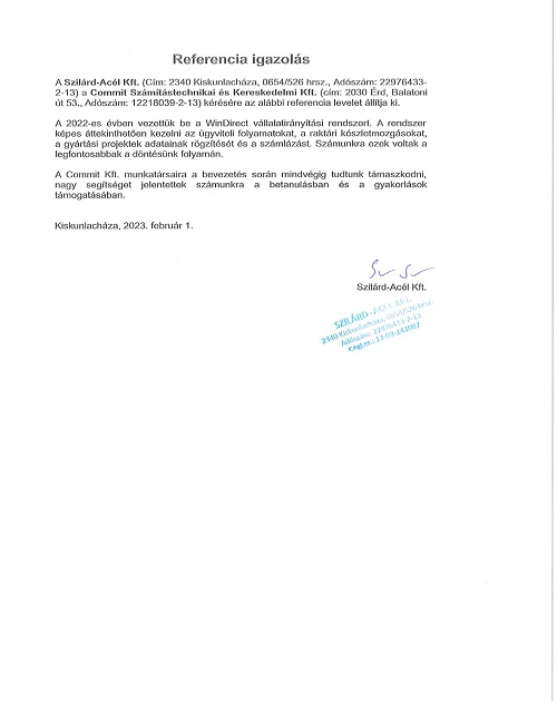 "Cégünk külföldi felvásárlása miatt kénytelenek voltunk a megadott ERP rendszert bevezetni a WinDirect helyett. A WinDirect-tel elégedettek voltunk, jól kiszolgálta a cég üzleti folyamatait. Köszönjük a WinDirect és a Commit Kft. együttműködését, különösen kollégáik nagyszerű szakmai és emberi hozzáállását."